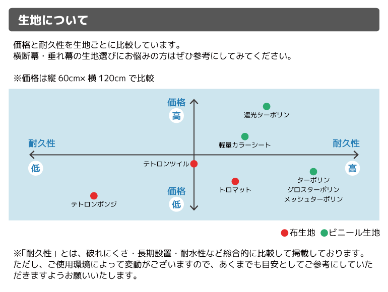 MAKUSHOPで取り扱いのある生地や加工・サイズについてご紹介します!設置場所や用途にあわせて自由に組み合わせてお選びください。